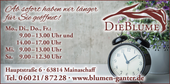 Unsere Filiale in Mainaschaff "Die Blume" ist Ihr Blumenfachgeschäft für Blumen aller Art im Landkreis Aschaffenburg. Wie in unserem Hauptbetrieb Blumen Ganter bieten wir Ihnen hier
